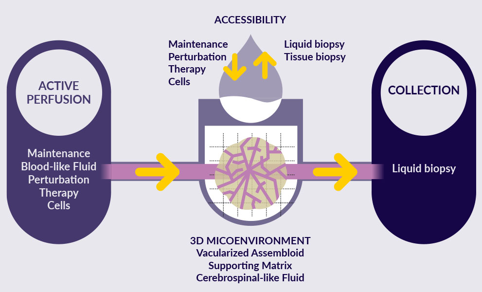 Due to the exceptional complexity of the brain, our in vitro technologies are designed to faithfully mimic its key features—integrating physiologically and physiopathological relevant structures for the vasculature and the immune system within the CNS environment.